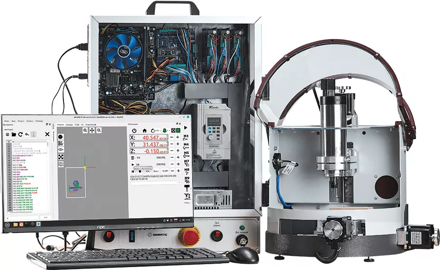 Настольные станки с ЧПУ, управляемые от персонального компьютера, соответствует по конструкции и функционированию промышленному стандарту. Габариты станков позволяют разместить их на обычном верстаке для удобства доступа к ним. В целях обеспечения безопасности учащихся, предусмотрена многоступенчатая, автоматическая защита рабочей области станков, которая закрывается прозрачным защитным экраном. Если ограждение не закрыто – запуск станка невозможен.Комплектация