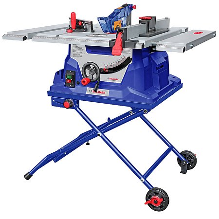Параллельный упор также можно поставить как справа, так и слева от пильного диска. На передней направляющей параллельного упора есть шкалы для точного позиционирования. Шкалами снабжены и штанги боковых столов. В комплектации этой модели есть дополнительное приспособление - упор для работы с узкими заготовками. он устанавливается как накладка на параллельную направляющую. Корпус изделия закрытый, изготовлен из пластика. Снабжен специальными держателями для упоров, толкателя, ключей и пильного диска.