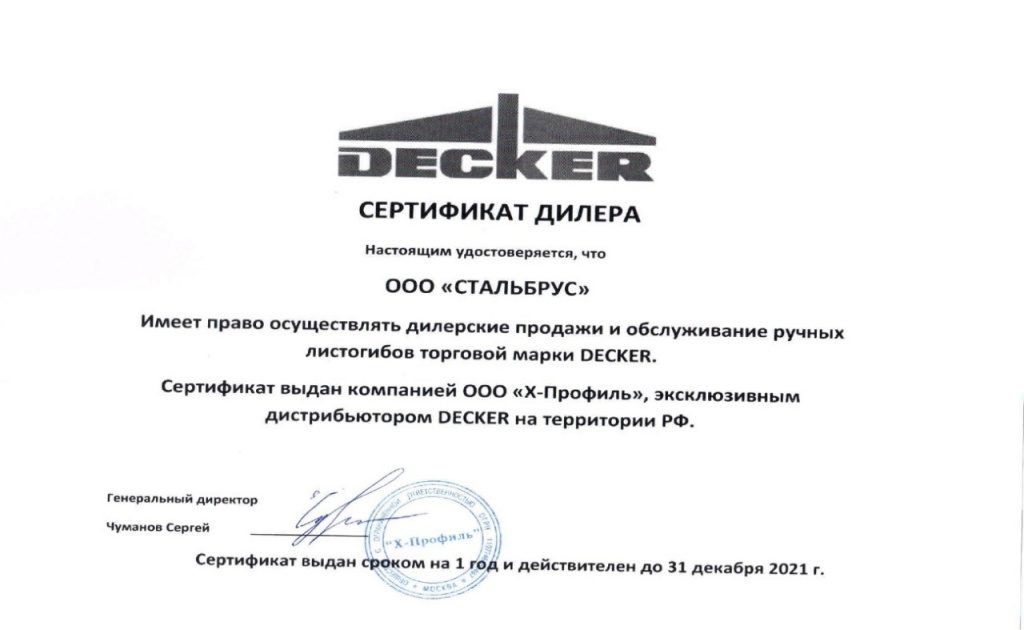 Сертификат дилера Decker