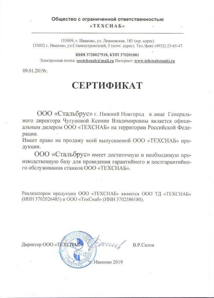 Сертификат дилера Станкоград